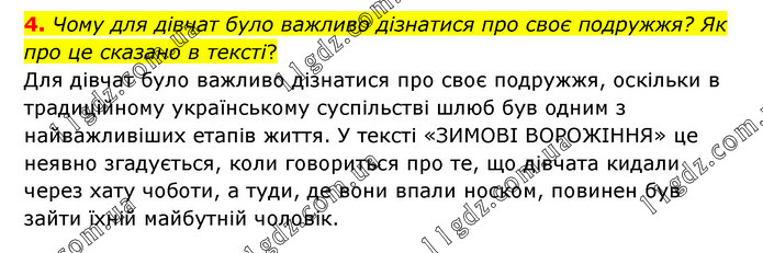 Чому для дівчат було важливо дізнатися про своє подружжя? Як про це сказано в тексті? Для дівчат було важливо дізнатися про своє подружжя, оскільки в традиційному українському суспільстві шлюб був одним з найважливіших етапів життя. У тексті «ЗИМОВІ ВОРОЖІННЯ» це неявно згадується, коли говориться про те, що дівчата кидали через хату чоботи, а туди, де вони впали носком, повинен був зайти їхній майбутній чоловік.
