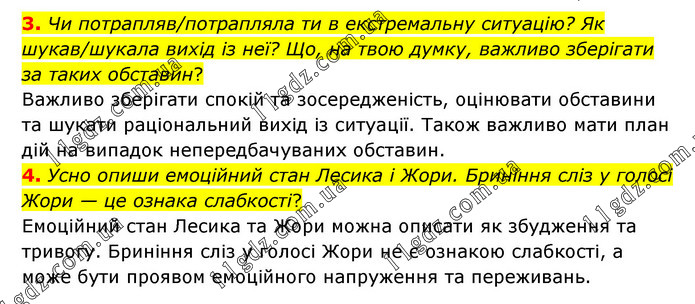 3. Чи потрапляв/потрапляла ти в екстремальну ситуацію? Як шукав/шукала вихід із неї? Що, на твою думку, важливо зберігати за таких обставин? Важливо зберігати спокій та зосередженість, оцінювати обставини та шукати раціональний вихід із ситуації. Також важливо мати план дій на випадок непередбачуваних обставин. 4. Усно опиши емоційний стан Лесика і Жори. Бриніння сліз у голосі Жори — це ознака слабкості? Емоційний стан Лесика та Жори можна описати як збудження та тривогу. Бриніння сліз у голосі Жори не є ознакою слабкості, а може бути проявом емоційного напруження та переживань.