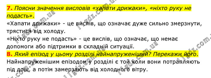 7. Поясни значення висловів «хапати дрижаки», «ніхто руку не подасть». «Хапати дрижаки» - це вислів, що означає дуже сильно змерзнути, трястися від холоду. «Ніхто руку не подасть» - це вислів, що означає, що немає допомоги або підтримки в складній ситуації. 8. Який епізод у цьому розділі найнапруженіший? Перекажи його. Найнапруженішим епізодом у розділі є той коли вони потрапляють під дощ, а потім замерзають від холодного вітру.