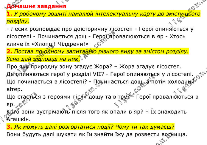 Домашнє завдання 1. У робочому зошиті намалюй інтелектуальну карту до змісту цього розділу. - Лесик розповідає про доісторичну лісостеп - Герої опиняються у лісостепі - Починається дощ - Герої провалюються в яр - Хтось кличе їх «Хлопці! Чілдрени!» 2. Постав по одному запитанню різного виду за змістом розділу. Усно дай відповіді на них. Про яку природну зону згадує Жора? – Жора згадує лісостеп. Де опиняються герої у розділі VII? - Герої опиняються у лісостепі. Що починається в лісостепі? - Починається дощ, а потім холодний вітер. Що стається з героями після дощу та вітру? - Герої провалюються в яр. Кого вони зустрічають після того як впали в яр? – Їх знаходить Агашкін. 3. Як можуть далі розгортатися події? Чому ти так думаєш? Вони будуть далі шукати як їм знайти їжу да розвести вогнища.