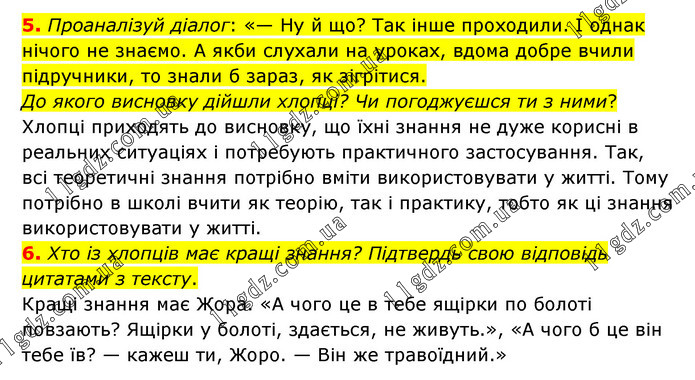 5. Проаналізуй діалог: «— Ну й що? Так інше проходили. І однак нічого не знаємо. А якби слухали на уроках, вдома добре вчили підручники, то знали б зараз, як зігрітися. До якого висновку дійшли хлопці? Чи погоджуєшся ти з ними? Хлопці приходять до висновку, що їхні знання не дуже корисні в реальних ситуаціях і потребують практичного застосування. Так, всі теоретичні знання потрібно вміти використовувати у житті. Тому потрібно в школі вчити як теорію, так і практику, тобто як ці знання використовувати у житті. 6. Хто із хлопців має кращі знання? Підтвердь свою відповідь цитатами з тексту. Кращі знання має Жора. «А чого це в тебе ящірки по болоті повзають? Ящірки у болоті, здається, не живуть.», «А чого б це він тебе їв? — кажеш ти, Жоро. — Він же травоїдний.»