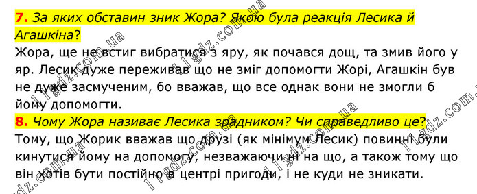 7. За яких обставин зник Жора? Якою була реакція Лесика й Агашкіна? Жора, ще не встиг вибратися з яру, як почався дощ, та змив його у яр. Лесик дуже переживав що не зміг допомогти Жорі, Агашкін був не дуже засмученим, бо вважав, що все однак вони не змогли б йому допомогти. 8. Чому Жора називає Лесика зрадником? Чи справедливо це? Тому, що Жорик вважав що друзі (як мінімум Лесик) повинні були кинутися йому на допомогу, незважаючи ні на що, а також тому що він хотів бути постійно в центрі пригоди, і не куди не зникати.
