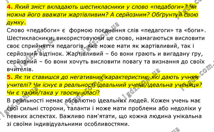 4. Який зміст вкладають шестикласники у слово «педабоги»? Чи можна його вважати жартівливим? А серйозним? Обґрунтуй свою думку. Слово «педабоги» є формою поєднання слів «педагоги» та «боги». Шестикласники, використовуючи це слово, намагаються висловити своє сприйняття педагогів, яке може мати як жартівливий, так і серйозний відтінок. Жартівливий – бо вони грають и вигадану гру, серйозний – бо вони хочуть висловити повагу та визнання до своїх вчителів. 5. Як ти ставишся до негативних характеристик, які дають учням учителі? Чи існує в реальності ідеальний учень/ідеальна учениця? Чи є такий/така у твоєму класі? В реальності немає абсолютно ідеальних людей. Кожен учень має свої сильні сторони, таланти і може мати проблеми або недоліки у певних аспектах. Важливо пам'ятати, що кожна людина унікальна зі своїми індивідуальними особливостями.