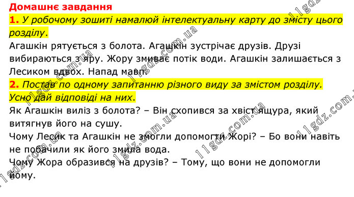 Домашнє завдання 1. У робочому зошиті намалюй інтелектуальну карту до змісту цього розділу. Агашкін рятується з болота. Агашкін зустрічає друзів. Друзі вибираються з яру. Жору змиває потік води. Агашкін залишається з Лесиком вдвох. Напад мавп. 2. Постав по одному запитанню різного виду за змістом розділу. Усно дай відповіді на них. Як Агашкін виліз з болота? – Він схопився за хвіст ящура, який витягнув його на сушу. Чому Лесик та Агашкін не змогли допомогти Жорі? – Бо вони навіть не побачили як його змила вода. Чому Жора образився на друзів? – Тому, що вони не допомогли йому.