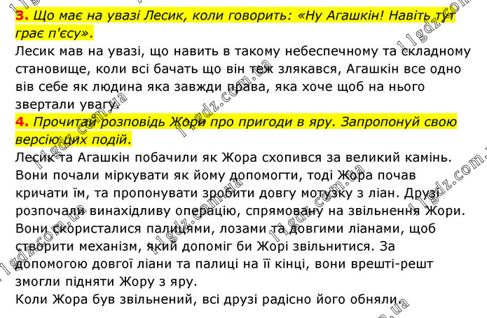 3. Що має на увазі Лесик, коли говорить: «Ну Агашкін! Навіть тут грає п'єсу». Лесик мав на увазі, що навить в такому небеспечному та складному становище, коли всі бачать що він теж злякався, Агашкін все одно вів себе як людина яка завжди права, яка хоче щоб на нього звертали увагу. 4. Прочитай розповідь Жори про пригоди в яру. Запропонуй свою версію цих подій. Лесик та Агашкін побачили як Жора схопився за великий камінь. Вони почали міркувати як йому допомогти, тоді Жора почав кричати їм, та пропонувати зробити довгу мотузку з ліан. Друзі розпочали винахідливу операцію, спрямовану на звільнення Жори. Вони скористалися палицями, лозами та довгими ліанами, щоб створити механізм, який допоміг би Жорі звільнитися. За допомогою довгої ліани та палиці на її кінці, вони врешті-решт змогли підняти Жору з яру. Коли Жора був звільнений, всі друзі радісно його обняли.