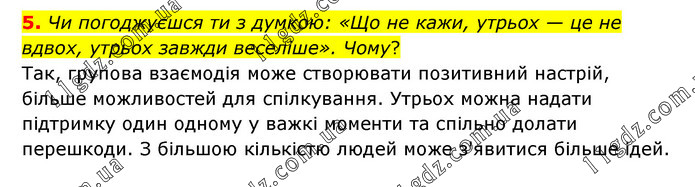 Чи погоджуєшся ти з думкою: «Що не кажи, утрьох — це не вдвох, утрьох завжди веселіше». Чому? Так, групова взаємодія може створювати позитивний настрій, більше можливостей для спілкування. Утрьох можна надати підтримку один одному у важкі моменти та спільно долати перешкоди. З більшою кількістю людей може з'явитися більше ідей.