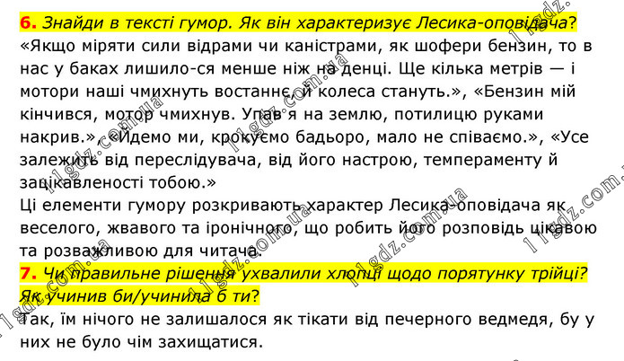 6. Знайди в тексті гумор. Як він характеризує Лесика-оповідача? «Якщо міряти сили відрами чи каністрами, як шофери бензин, то в нас у баках лишилося менше ніж на денці. Ще кілька метрів — і мотори наші чмихнуть востаннє, й колеса стануть.», «Бензин мій кінчився, мотор чмихнув. Упав я на землю, потилицю руками накрив.», «Йдемо ми, крокуємо бадьоро, мало не співаємо.», «Усе залежить від переслідувача, від його настрою, темпераменту й зацікавленості тобою.» Ці елементи гумору розкривають характер Лесика-оповідача як веселого, жвавого та іронічного, що робить його розповідь цікавою та розважливою для читача. 7. Чи правильне рішення ухвалили хлопці щодо порятунку трійці? Як учинив би/учинила б ти? Так, їм нічого не залишалося як тікати від печерного ведмедя, бу у них не було чім захищатися.