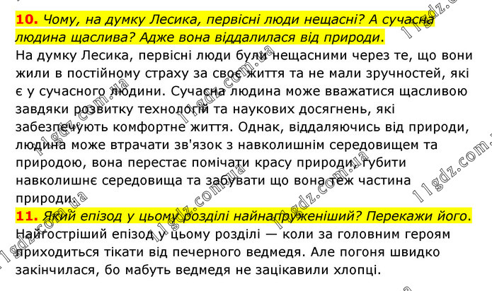 10. Чому, на думку Лесика, первісні люди нещасні? А сучасна людина щаслива? Адже вона віддалилася від природи. На думку Лесика, первісні люди були нещасними через те, що вони жили в постійному страху за своє життя та не мали зручностей, які є у сучасного людини. Сучасна людина може вважатися щасливою завдяки розвитку технологій та наукових досягнень, які забезпечують комфортне життя. Однак, віддаляючись від природи, людина може втрачати зв'язок з навколишнім середовищем та природою, вона перестає помічати красу природи, губити навколишнє середовища та забувати що вона теж частина природи. 11. Який епізод у цьому розділі найнапруженіший? Перекажи його. Найгостріший епізод у цьому розділі — коли за головним героям приходиться тікати від печерного ведмедя. Але погоня швидко закінчилася, бо мабуть ведмедя не зацікавили хлопці.