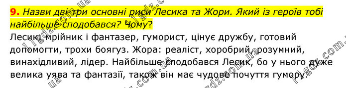 Назви дві-три основні риси Лесика та Жори. Який із героїв тобі найбільше сподобався? Чому? Лесик: мрійник і фантазер, гуморист, цінує дружбу, готовий допомогти, трохи боягуз. Жора: реаліст, хоробрий, розумний, винахідливий, лідер. Найбільше сподобався Лесик, бо у нього дуже велика уява та фантазії, також він має чудове почуття гумору.