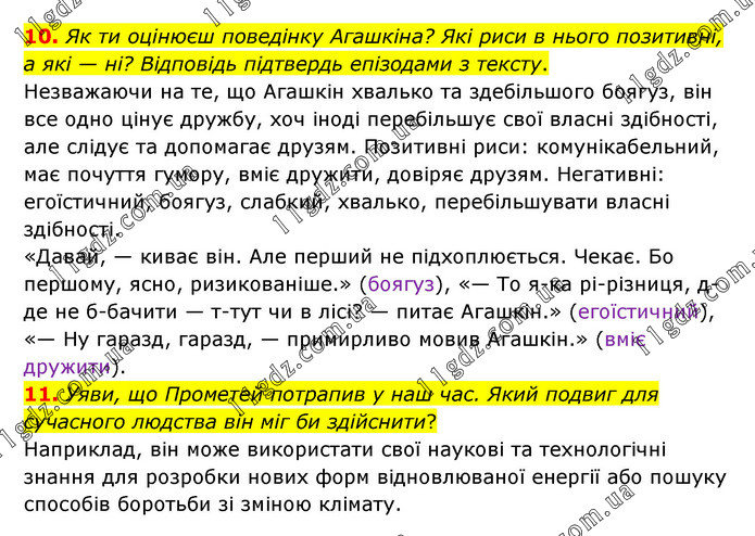 10. Як ти оцінюєш поведінку Агашкіна? Які риси в нього позитивні, а які — ні? Відповідь підтвердь епізодами з тексту. Незважаючи на те, що Агашкін хвалько та здебільшого боягуз, він все одно цінує дружбу, хоч іноді перебільшує свої власні здібності, але слідує та допомагає друзям. Позитивні риси: комунікабельний, має почуття гумору, вміє дружити, довіряє друзям. Негативні: егоїстичний, боягуз, слабкий, хвалько, перебільшувати власні здібності. «Давай, — киває він. Але перший не підхоплюється. Чекає. Бо першому, ясно, ризикованіше.» (боягуз), «— То я-ка рі-різниця, д-де не б-бачити — т-тут чи в лісі? — питає Агашкін.» (егоїстичний), «— Ну гаразд, гаразд, — примирливо мовив Агашкін.» (вміє дружити). 11. Уяви, що Прометей потрапив у наш час. Який подвиг для сучасного людства він міг би здійснити? Наприклад, він може використати свої наукові та технологічні знання для розробки нових форм відновлюваної енергії або пошуку способів боротьби зі зміною клімату.