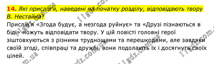 14. Які прислів'я, наведені на початку розділу, відповідають твору В. Нестайка? Прислів'я «Згода будує, а незгода руйнує» та «Друзі пізнаються в біді» можуть відповідати твору. У цій повісті головні герої зіштовхуються з різними труднощами та перешкодами, але завдяки своїй згоді, співпраці та дружбі, вони подолають їх і досягнуть своїх цілей.
