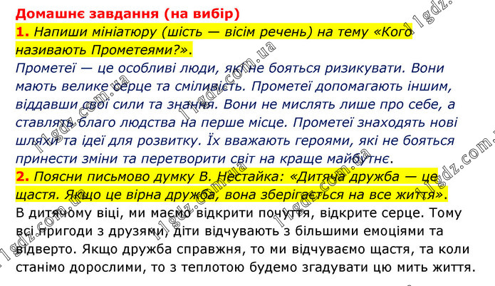 Домашнє завдання (на вибір) 1. Напиши мініатюру (шість — вісім речень) на тему «Кого називають Прометеями?». Прометеї — це особливі люди, які не бояться ризикувати. Вони мають велике серце та сміливість. Прометеї допомагають іншим, віддавши свої сили та знання. Вони не мислять лише про себе, а ставлять благо людства на перше місце. Прометеї знаходять нові шляхи та ідеї для розвитку. Їх вважають героями, які не бояться принести зміни та перетворити світ на краще майбутнє. 2. Поясни письмово думку В. Нестайка: «Дитяча дружба — це щастя. Якщо це вірна дружба, вона зберігається на все життя». В дитячому віці, ми маємо відкрити почуття, відкрите серце. Тому всі пригоди з друзями, діти відчувають з більшими емоціями та відверто. Якщо дружба справжня, то ми відчуваємо щастя, та коли станімо дорослими, то з теплотою будемо згадувати цю мить життя.