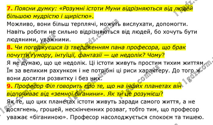 7. Поясни думку: «Розумні істоти Муни відрізняються від людей більшою мудрістю і щирістю». Можливо, вони більш терплячі, можуть вислухати, допомогти. Навіть роботи не сильно відрізняються від людей, бо хочуть бути людяними, уважними. 8. Чи погоджуєшся із твердженням пана професора, що брак почуття гумору, інтуїції, фантазії — це недолік? Чому? Я не думаю, що це недолік. Ці істоти живуть простим тихим життям. Їм за великим рахунком і не потрібні ці риси характеру. До того ж вони досягли розвитку і без них. 9. Професор Філ говорить про те, що на інших планетах він відпочиває від «земної біганини». Як ти це розумієш? Як те, що цих планетах істоти живуть заради самого життя, а не досягнень, грошей, нескінченних розваг, тобто тим, що професор уважає «біганиною». Професор насолоджується спокоєм та тишею.