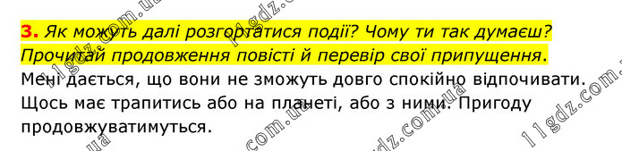 3. Як можуть далі розгортатися події? Чому ти так думаєш? Прочитай продовження повісті й перевір свої припущення. Мені дається, що вони не зможуть довго спокійно відпочивати. Щось має трапитись або на планеті, або з ними. Пригоду продовжуватимуться.
