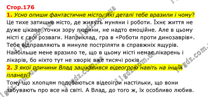 1. Усно опиши фантастичне місто. Які деталі тебе вразили і чому? Це тихе затишне місто, де живуть муняни і роботи. Їхнє життя не дуже цікаве точки зору людини, не надто емоційне. Але в цьому місті є свої розваги. Наприклад, гра в «Роботи проти динозаврів». Тебе відправляють в минуле постріляти в справжніх ящурів. Найбільше мене вразило те, що в цьому місті немає лікарень і лікарів, бо ніхто тут не хворіє вже тисячі років. 2. З якої причини Влад зацікавився відеогрою навіть на іншій планеті? Тому що хлопцям подобаються відеоігри настільки, що вони забувають про все на світі. А Влад, до того ж, їх особливо любив.