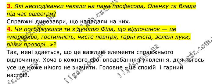 3. Які несподіванки чекали на пана професора, Оленку та Влада під час відеогри? Справжні динозаври, що нападали на них. 4. Чи погоджуєшся ти з думкою Філа, що відпочинок — це «морозиво, гостинність, чисте повітря, гарні міста, зелені луки, річки прозорі…»? Так, мені здається, що це важливі елементи справжнього відпочинку. Хоча в кожного свої вподобання і уявлення. для когось усе це може нічого не значити. Головне - це спокій і гарний настрій.