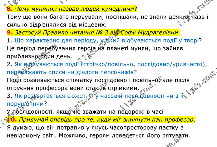 8. Чому мунянин назвав людей кумедними? Тому що вони багато нервували, поспішали, не знали деяких назв і сильно відрізнялися від місцевих. 9. Застосуй Правило читання № 3 від Софії Мудрагелівни. 1. Що характерно для періоду, у який відбуваються події у творі? Це період перебування героїв на планеті мунян, що зайняв приблизно один день. 2. Як відбуваються події (стрімко/повільно, послідовно/уривчасто), переважають описи чи діалоги персонажів? Події розвиваються спочатку послідовно і повільно, але після отруєння професора вони стають стрімкими. 3. Як розгортається сюжет — у часовій послідовності чи з її порушенням? У послідовності, якщо не зважати на подорожі в часі 10. Придумай оповідь про те, куди міг зникнути пан професор. Я думаю, що він потрапив у якусь часопросторову пастку в невідомому світі. Можливо, героям доведеться його рятувати.