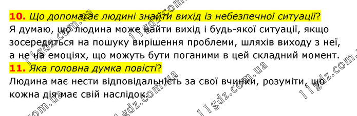 10. Що допомагає людині знайти вихід із небезпечної ситуації? Я думаю, що людина може найти вихід і будь-якої ситуації, якщо зосередиться на пошуку вирішення проблеми, шляхів виходу з неї, а не на емоціях, що можуть бути поганими в цей складний момент. 11. Яка головна думка повісті? Людина має нести відповідальність за свої вчинки, розуміти, що кожна дія має свій наслідок.
