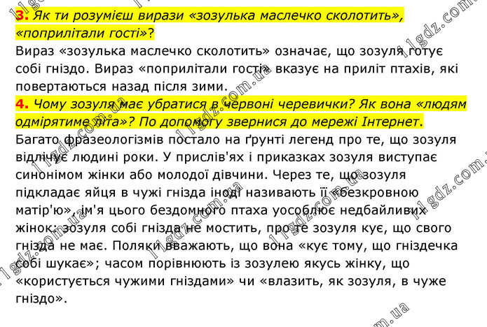 3. Як ти розумієш вирази «зозулька маслечко сколотить», «поприлітали гості»? Вираз «зозулька маслечко сколотить» означає, що зозуля готує собі гніздо. Вираз «поприлітали гості» вказує на приліт птахів, які повертаються назад після зими. 4. Чому зозуля має убратися в червоні черевички? Як вона «людям одмірятиме літа»? По допомогу звернися до мережі Інтернет. Багато фразеологізмів постало на ґрунті легенд про те, що зозуля відлічує людині роки. У прислів'ях і приказках зозуля виступає синонімом жінки або молодої дівчини. Через те, що зозуля підкладає яйця в чужі гнізда іноді називають її «безкровною матір'ю», ім'я цього бездомного птаха уособлює недбайливих жінок: зозуля собі гнізда не мостить, про те зозуля кує, що свого гнізда не має. Поляки вважають, що вона «кує тому, що гніздечка собі шукає»; часом порівнюють із зозулею якусь жінку, що «користується чужими гніздами» чи «влазить, як зозуля, в чуже гніздо».