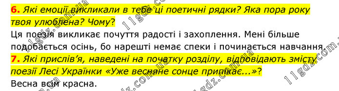 6. Які емоції викликали в тебе ці поетичні рядки? Яка пора року твоя улюблена? Чому? Ця поезія викликає почуття радості і захоплення. Мені більше подобається осінь, бо нарешті немає спеки і починається навчання. 7. Які прислів’я, наведені на початку розділу, відповідають змісту поезії Лесі Українки «Уже весняне сонце припікає...»? Весна всім красна.