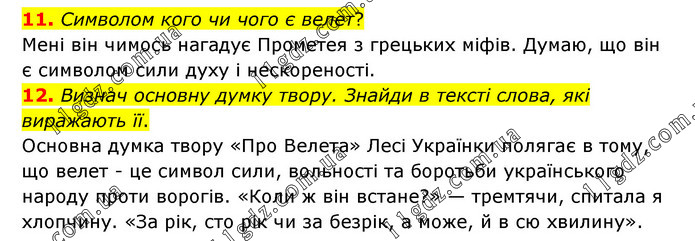 11. Символом кого чи чого є велет? Мені він чимось нагадує Прометея з грецьких міфів. Думаю, що він є символом сили духу і нескореності. 12. Визнач основну думку твору. Знайди в тексті слова, які виражають її. Основна думка твору «Про Велета» Лесі Українки полягає в тому, що велет - це символ сили, вольності та боротьби українського народу проти ворогів. «Коли ж він встане?» — тремтячи, спитала я хлопчину. «За рік, сто рік чи за безрік, а може, й в сю хвилину».