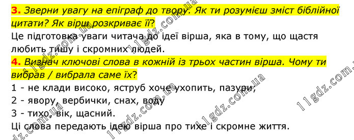 3. Зверни увагу на епіграф до твору. Як ти розумієш зміст біблійної цитати? Як вірш розкриває її? Це підготовка уваги читача до ідеї вірша, яка в тому, що щастя любить тишу і скромних людей. 4. Визнач ключові слова в кожній із трьох частин вірша. Чому ти вибрав / вибрала саме їх? 1 - не клади високо, яструб хоче ухопить, пазури; 2 - явору, вербички, снах, воду 3 - тихо, вік, щасний. Ці слова передають ідею вірша про тихе і скромне життя.