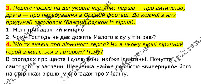3. Поділи поезію на дві умовні частини: перша — про дитинство, друга — про перебування в Орській фортеці. До кожної з них придумай заголовок (бажано рядком із вірша). 1. Мені тринадцятий минало 2. Чому Господь не дав дожить Малого віку у тім раю? 4. Що ти знаєш про ліричного героя? Чи в цьому вірші ліричний герой зливається з автором? Чому? В спогадах про щастя і долю вони майже ідентичні. Почуття самотності у засланні Шевченка майже повністю «вивернуло» його на сторінках віршів, у спогадах про Україну.