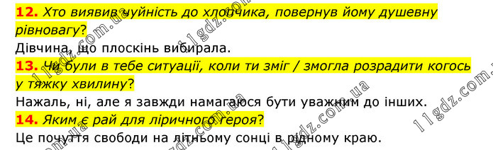 12. Хто виявив чуйність до хлопчика, повернув йому душевну рівновагу? Дівчина, що плоскінь вибирала. 13. Чи були в тебе ситуації, коли ти зміг / змогла розрадити когось у тяжку хвилину? Нажаль, ні, але я завжди намагаюся бути уважним до інших. 14. Яким є рай для ліричного героя? Це почуття свободи на літньому сонці в рідному краю.