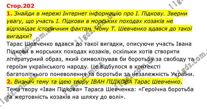 1. Знайди в мережі Інтернет інформацію про І. Підкову. Зверни увагу, що участь І. Підкови в морських походах козаків не відповідає історичним фактам. Чому Т. Шевченко вдався до такої вигадки? Тарас Шевченко вдався до такої вигадки, описуючи участь Івана Підкови в морських походах козаків, оскільки хотів створити літературний образ, який символізував би боротьбу за свободу та героїзм українського народу. Це відбулося в контексті багатолітнього поневолення та боротьби за незалежність України. 2. Визнач тему та ідею твору ІВАН ПІДКОВА Тарас Шевченко. Тема твору «Іван Підкова» Тараса Шевченка: «Героїчна боротьба та жертовність козаків на шляху до волі».