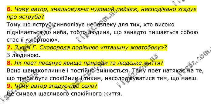 6. Чому автор, змальовуючи чудовий пейзаж, несподівано згадує про яструба? Тому що яструб символізує небезпеку для тих, хто високо піднімається до неба, тобто людина, що занадто пишається собою стає її «жертвою». 7. З ким Г. Сковорода порівнює «пташину жовтобоку»? З людиною. 8. Як поет поєднує явища природи та людське життя? Воно швидкоплинне і постійно змінюється. Тому поет натякає на те, що треба бути спокійним і тихим, насолоджуватися тим, що маєш. 9. Чому автор згадує про село? Це символ щасливого спокійного життя.