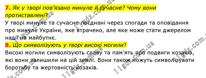 7. Як у творі пов’язано минуле й сучасне? Чому вони протиставлені? У творі минуле та сучасне поєднані через спогади та оповідання про минуле України, яке втрачено, але яке може стати джерелом надії на майбутнє. 8. Що символізують у творі високі могили? Високі могили символізують славу та пам'ять про подвиги козаків, які вони залишили на цій землі. Вони також можуть символізувати боротьбу та жертовність козаків.