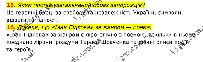 15. Яким постає узагальнений образ запорожців? Це героїчні борці за свободу та незалежність України, символи відваги та гідності. 16. Доведи, що «Іван Підкова» за жанром — поема. «Іван Підкова» за жанром є ліро-епічною поемою, оскільки в ньому поєднано ліричні роздуми Тараса Шевченка та епічні описи подій та героїв.