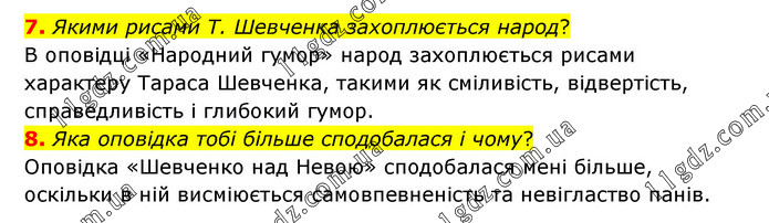 7. Якими рисами Т. Шевченка захоплюється народ? В оповідці «Народний гумор» народ захоплюється рисами характеру Тараса Шевченка, такими як сміливість, відвертість, справедливість і глибокий гумор. 8. Яка оповідка тобі більше сподобалася і чому? Оповідка «Шевченко над Невою» сподобалася мені більше, оскільки в ній висміюється самовпевненість та невігластво панів.