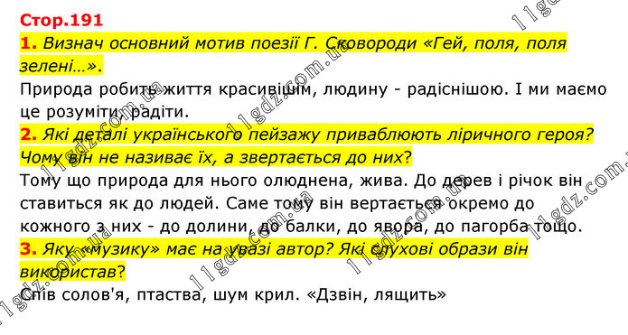 1. Визнач основний мотив поезії Г. Сковороди «Гей, поля, поля зелені…». Природа робить життя красивішім, людину - радіснішою. І ми маємо це розуміти, радіти. 2. Які деталі українського пейзажу приваблюють ліричного героя? Чому він не називає їх, а звертається до них? Тому що природа для нього олюднена, жива. До дерев і річок він ставиться як до людей. Саме тому він вертається окремо до кожного з них - до долини, до балки, до явора, до пагорба тощо. 3. Яку «музику» має на увазі автор? Які слухові образи він використав? Спів солов'я, птаства, шум крил. «Дзвін, лящить»