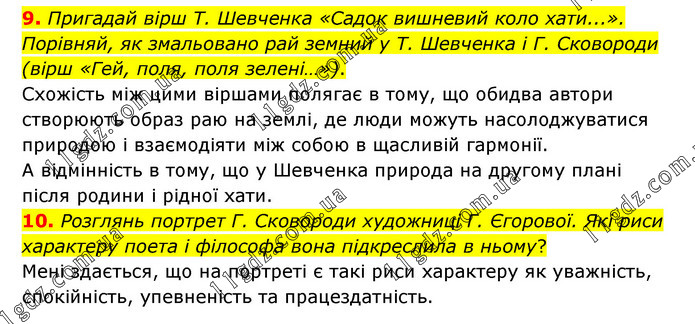 9. Пригадай вірш Т. Шевченка «Садок вишневий коло хати...». Порівняй, як змальовано рай земний у Т. Шевченка і Г. Сковороди (вірш «Гей, поля, поля зелені…»). Схожість між цими віршами полягає в тому, що обидва автори створюють образ раю на землі, де люди можуть насолоджуватися природою і взаємодіяти між собою в щасливій гармонії. А відмінність в тому, що у Шевченка природа на другому плані після родини і рідної хати. 10. Розглянь портрет Г. Сковороди художниці Г. Єгорової. Які риси характеру поета і філософа вона підкреслила в ньому? Мені здається, що на портреті є такі риси характеру як уважність, спокійність, упевненість та працездатність.