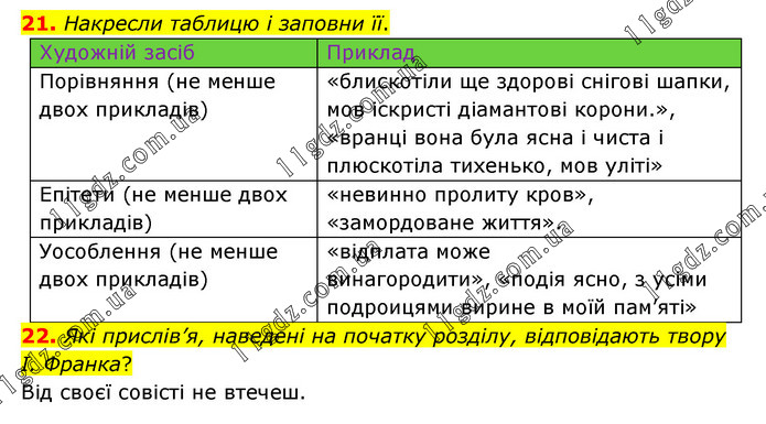 21. Накресли таблицю і заповни її. Художній засіб Приклад Порівняння (не менше двох прикладів) «блискотiли ще здоровi снiговi шапки, мов iскристi дiамантовi корони.», «вранцi вона була ясна i чиста i плюскотiла тихенько, мов улiтi» Епітети (не менше двох прикладів) «невинно пролиту кров», «замордоване життя». Уособлення (не менше двох прикладів) «вiдплата може винагородити», «подiя ясно, з усiми подроицями вирине в моїй пам’ятi» 22. Які прислів’я, наведені на початку розділу, відповідають твору І. Франка? Від своєї совісті не втечеш.