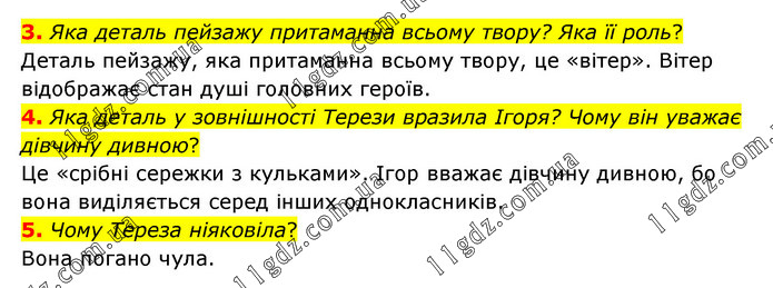 3. Яка деталь пейзажу притаманна всьому твору? Яка її роль? Деталь пейзажу, яка притаманна всьому твору, це «вітер». Вітер відображає стан душі головних героїв. 4. Яка деталь у зовнішності Терези вразила Ігоря? Чому він уважає дівчину дивною? Це «срібні сережки з кульками». Ігор вважає дівчину дивною, бо вона виділяється серед інших однокласників. 5. Чому Тереза ніяковіла? Вона погано чула.