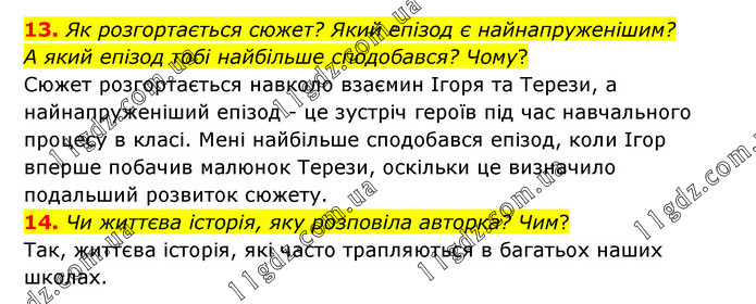 13. Як розгортається сюжет? Який епізод є найнапруженішим? А який епізод тобі найбільше сподобався? Чому? Сюжет розгортається навколо взаємин Ігоря та Терези, а найнапруженіший епізод - це зустріч героїв під час навчального процесу в класі. Мені найбільше сподобався епізод, коли Ігор вперше побачив малюнок Терези, оскільки це визначило подальший розвиток сюжету. 14. Чи життєва історія, яку розповіла авторка? Чим? Так, життєва історія, які часто трапляються в багатьох наших школах.