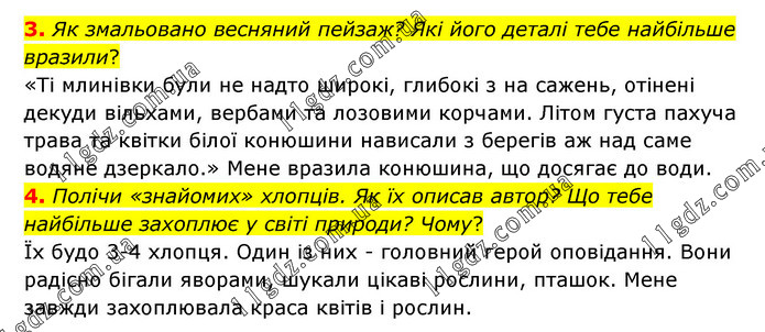 3. Як змальовано весняний пейзаж? Які його деталі тебе найбільше вразили? «Тi млинiвки були не надто широкi, глибокi з на сажень, отiненi декуди вiльхами, вербами та лозовими корчами. Лiтом густа пахуча трава та квiтки бiлої конюшини нависали з берегiв аж над саме водяне дзеркало.» Мене вразила конюшина, що досягає до води. 4. Полічи «знайомих» хлопців. Як їх описав автор? Що тебе найбільше захоплює у світі природи? Чому? Їх будо 3-4 хлопця. Один із них - головний герой оповідання. Вони радісно бігали яворами, шукали цікаві рослини, пташок. Мене завжди захоплювала краса квітів і рослин.