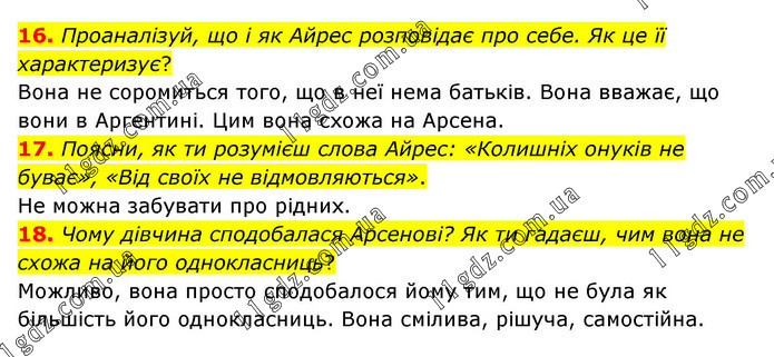 16. Проаналізуй, що і як Айрес розповідає про себе. Як це її характеризує? Вона не соромиться того, що в неї нема батьків. Вона вважає, що вони в Аргентині. Цим вона схожа на Арсена. 17. Поясни, як ти розумієш слова Айрес: «Колишніх онуків не буває», «Від своїх не відмовляються». Не можна забувати про рідних. 18. Чому дівчина сподобалася Арсенові? Як ти гадаєш, чим вона не схожа на його однокласниць? Можливо, вона просто сподобалося йому тим, що не була як більшість його однокласниць. Вона смілива, рішуча, самостійна.