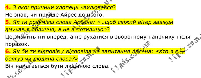 4. З якої причини хлопець хвилювався? Не знав, чи прийде Айрес до нього. 5. Як ти розумієш слова Арсена: «…щоб свіжий вітер завжди дмухав в обличчя, а не в потилицю»? Це значить іти вперед, а не рухатися в зворотному напрямку після поразок. 6. Як би ти відповів / відповіла на запитання Арсена: «Хто я є —боягуз чи людина слова?» Він намагається бути людиною слова.