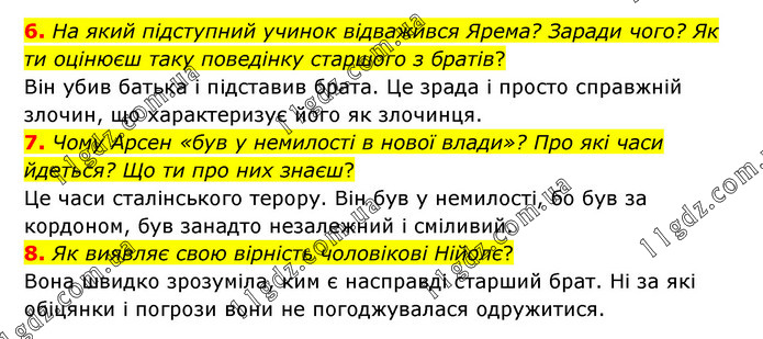 6. На який підступний учинок відважився Ярема? Заради чого? Як ти оцінюєш таку поведінку старшого з братів? Він убив батька і підставив брата. Це зрада і просто справжній злочин, що характеризує його як злочинця. 7. Чому Арсен «був у немилості в нової влади»? Про які часи йдеться? Що ти про них знаєш? Це часи сталінського терору. Він був у немилості, бо був за кордоном, був занадто незалежний і сміливий. 8. Як виявляє свою вірність чоловікові Нійолє? Вона швидко зрозуміла, ким є насправді старший брат. Ні за які обіцянки і погрози вони не погоджувалася одружитися.