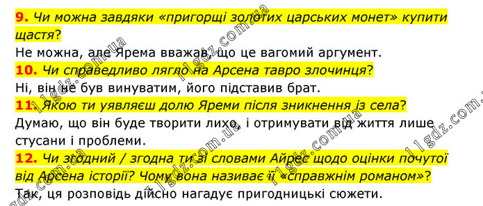 9. Чи можна завдяки «пригорщі золотих царських монет» купити щастя? Не можна, але Ярема вважав, що це вагомий аргумент. 10. Чи справедливо лягло на Арсена тавро злочинця? Ні, він не був винуватим, його підставив брат. 11. Якою ти уявляєш долю Яреми після зникнення із села? Думаю, що він буде творити лихо, і отримувати від життя лише стусани і проблеми. 12. Чи згодний / згодна ти зі словами Айрес щодо оцінки почутої від Арсена історії? Чому вона називає її «справжнім романом»? Так, ця розповідь дійсно нагадує пригодницькі сюжети.
