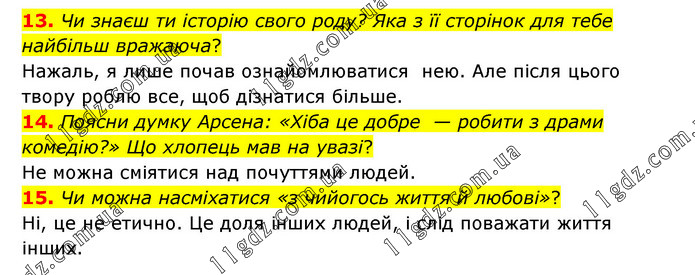 13. Чи знаєш ти історію свого роду? Яка з її сторінок для тебе найбільш вражаюча? Нажаль, я лише почав ознайомлюватися нею. Але після цього твору роблю все, щоб дізнатися більше. 14. Поясни думку Арсена: «Хіба це добре — робити з драми комедію?» Що хлопець мав на увазі? Не можна сміятися над почуттями людей. 15. Чи можна насміхатися «з чийогось життя й любові»? Ні, це не етично. Це доля інших людей, і слід поважати життя інших.