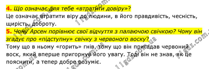 4. Що означає для тебе «втратити довіру»? Це означає втратити віру до людини, в його правдивість, чесність, щирість, доброту. 5. Чому Арсен порівнює свої відчуття з палаючою свічкою? Чому він згадує про «підступну» свічку з червоного воску? Тому що в ньому «горить» гнів, тому що він пригадав червоний воск, який вперше пригорнув його увагу. Тоді він не знав, як це пояснити, а тепер добре розуміє.