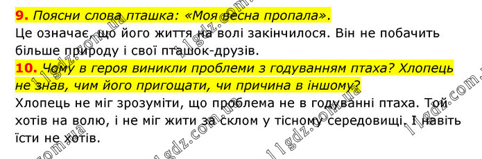 9. Поясни слова пташка: «Моя весна пропала». Це означає, що його життя на волі закінчилося. Він не побачить більше природу і свої пташок-друзів. 10. Чому в героя виникли проблеми з годуванням птаха? Хлопець не знав, чим його пригощати, чи причина в іншому? Хлопець не міг зрозуміти, що проблема не в годуванні птаха. Той хотів на волю, і не міг жити за склом у тісному середовищі. І навіть їсти не хотів.
