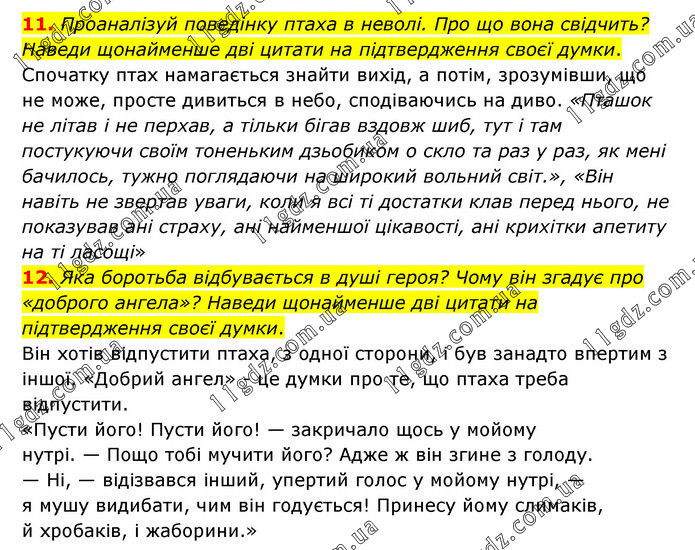 11. Проаналізуй поведінку птаха в неволі. Про що вона свідчить? Наведи щонайменше дві цитати на підтвердження своєї думки. Спочатку птах намагається знайти вихід, а потім, зрозумівши, що не може, просте дивиться в небо, сподіваючись на диво. «Пташок не лiтав i не перхав, а тiльки бiгав вздовж шиб, тут i там постукуючи своїм тоненьким дзьобиком о скло та раз у раз, як менi бачилось, тужно поглядаючи на широкий вольний свiт.», «Вiн навiть не звертав уваги, коли я всi тi достатки клав перед нього, не показував анi страху, анi найменшої цiкавостi, анi крихiтки апетиту на тi ласощi» 12. Яка боротьба відбувається в душі героя? Чому він згадує про «доброго ангела»? Наведи щонайменше дві цитати на підтвердження своєї думки. Він хотів відпустити птаха, з одної сторони, і був занадто впертим з іншої. «Добрий ангел» - це думки про те, що птаха треба відпустити. «Пусти його! Пусти його! — закричало щось у мойому нутрi. — Пощо тобi мучити його? Адже ж вiн згине з голоду. — Нi, — вiдiзвався iнший, упертий голос у мойому нутрi, — я мушу видибати, чим вiн годується! Принесу йому слимакiв, й хробакiв, i жаборини.»