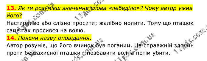 13. Як ти розумієш значення слова «лебеділо»? Чому автор ужив його? Настирливо або слізно просити; жалібно молити. Тому що пташок саме так просився на волю. 14. Поясни назву оповідання. Автор розуміє, що його вчинок був поганим. Це справжній злочин проти беззахисної пташки - позбавити волі а потім убити.
