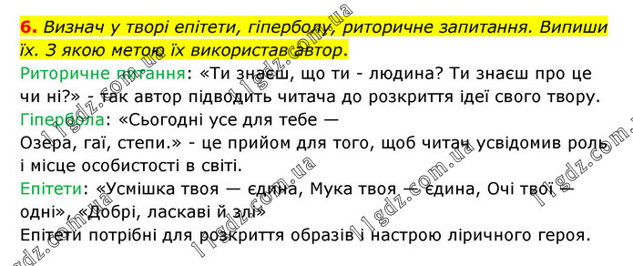 6. Визнач у творі епітети, гіперболу, риторичне запитання. Випиши їх. З якою метою їх використав автор. Риторичне питання: «Ти знаєш, що ти - людина? Ти знаєш про це чи ні?» - так автор підводить читача до розкриття ідеї свого твору. Гіпербола: «Сьогодні усе для тебе — Озера, гаї, степи.» - це прийом для того, щоб читач усвідомив роль і місце особистості в світі. Епітети: «Усмішка твоя — єдина, Мука твоя — єдина, Очі твої — одні», «Добрі, ласкаві й злі» Епітети потрібні для розкриття образів і настрою ліричного героя.