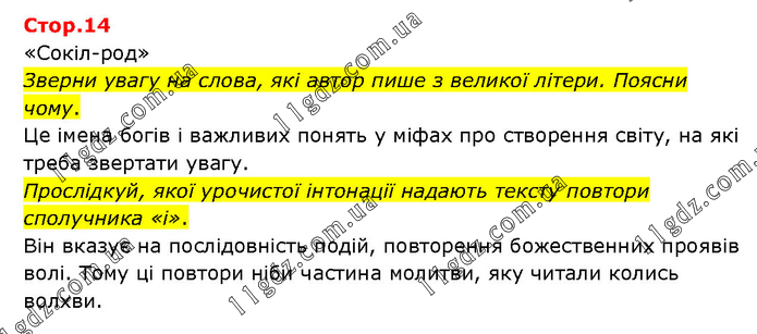 «Сокіл-род» Зверни увагу на слова, які автор пише з великої літери. Поясни чому. Це імена богів і важливих понять у міфах про створення світу, на які треба звертати увагу. Прослідкуй, якої урочистої інтонації надають тексту повтори сполучника «і». Він вказує на послідовність подій, повторення божественних проявів волі. Тому ці повтори ніби частина молитви, яку читали колись волхви.